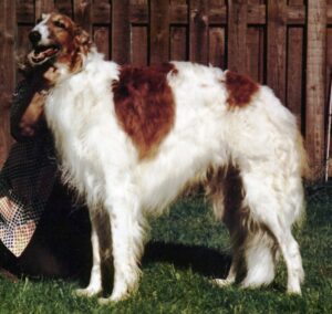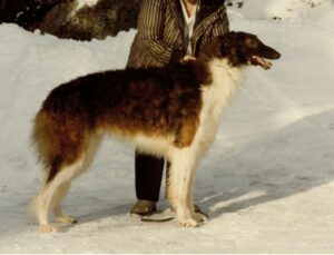 The modern Finnish Borzoi decends from Soviet, German, Swiss and Swedish lines. In 1961, “Finlands Hunting and Fishing Society” imported a male and a bitch, Udaloi and Raketa, who had a litter in 1962. They also imported another bitch, Metschta, who had two litters with Udaloi in ’64 and ’65. In the first litter came Ch Amurat, he sired a litter for kennel Oseroff.