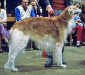 Erraskai sired two litters at Kaznan. Two of the bitches were exported to Sweden, Int Ch Kaznan Eskaja had one litter at Carat’s & Kaznan Ewenka gave birth to one litter at Helenetorps, Sweden. Kaznans G-litter containing 4 Ch-s (3 Int) became very important, with several breeding on, Int Ch Kaznan Grafinja for Swedish Grafinja kenneland Int Ch Kaznan Gaika had 3 litters for Kaznan and in the M-litter, Int Ch Kaznan Misek was born. He was probably the greatest Show Star fromKaznan, with numerous great wins. He was Finlands Topwinner for three years and also BIS at different Borzoi Specials. Around 1980 Int Ch Mumtaz Mahal’s Patrinka was imported from Germany. She had three litters for Kaznan. In 1984 Int Ch Polongain Fjor was used for the R-litter, none went on breeding. In the U-litter Ch Kaznan Udalka went to Eli Gunneng in Norway, and became foundation for her Stravi kennel. In 1987 Alena Zinar born in Poland, came to Kaznan. She was out of famous Czech stud & show dog Int Ch Florestan z Lárisova and brought