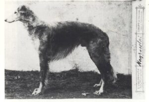 He was said to have played the main role in the wolfhunting scenes in Sergeij Bondartjuks film “War& Peace”. Imported from Moscow, a gift from Nikita Chrustiev to Lord & Lady Sternberg, He became most important as a studdog in England. Siring litters for Fortrouge and Keepers.